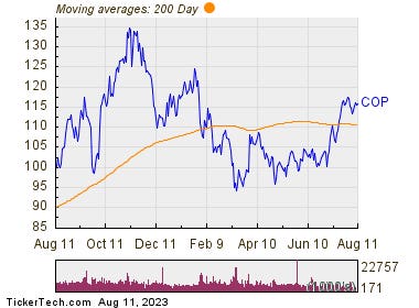 On 8/15/23, ConocoPhillips will trade ex-dividend, for its quarterly dividend of $0.51, payable on 9/1/23. As a percentage of COP’s recent stock price of $116.17, this dividend works out to approximately 0.44%.