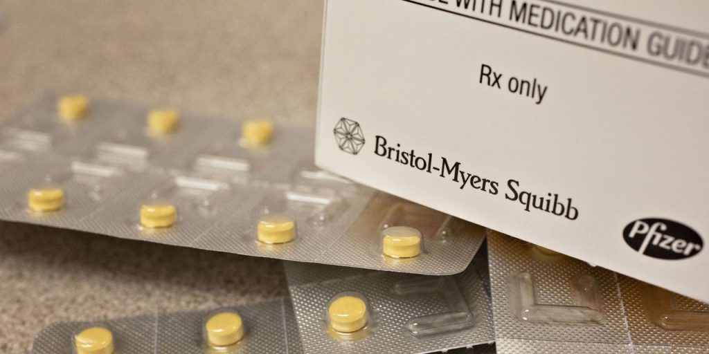 Bristol Myers Squibb trades at about eight times earnings. Pictured above, its Eliquis tablets.
